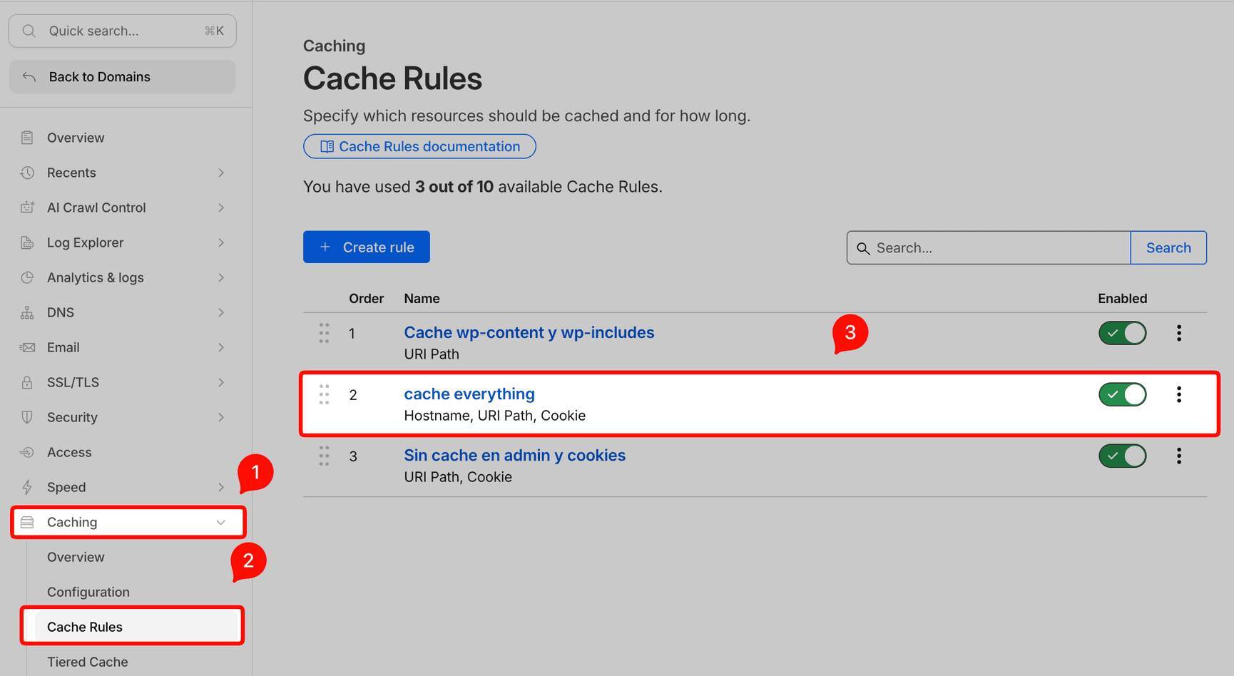 El orden de estas tres reglas importa. Primero, Cache wp-content y wp-includes, luego Cache Everything y finalmente Sin cache en admin y cookies.