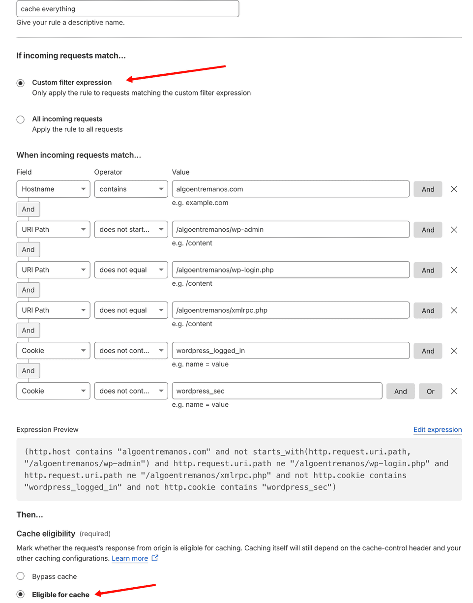 Cuando tienes la regla escrita, es muy importante elegir Cache eligibility y poner Eligible for cache. Después tenemos que configurar un poco las cosas. Te lo cuento después de esta imagen.
