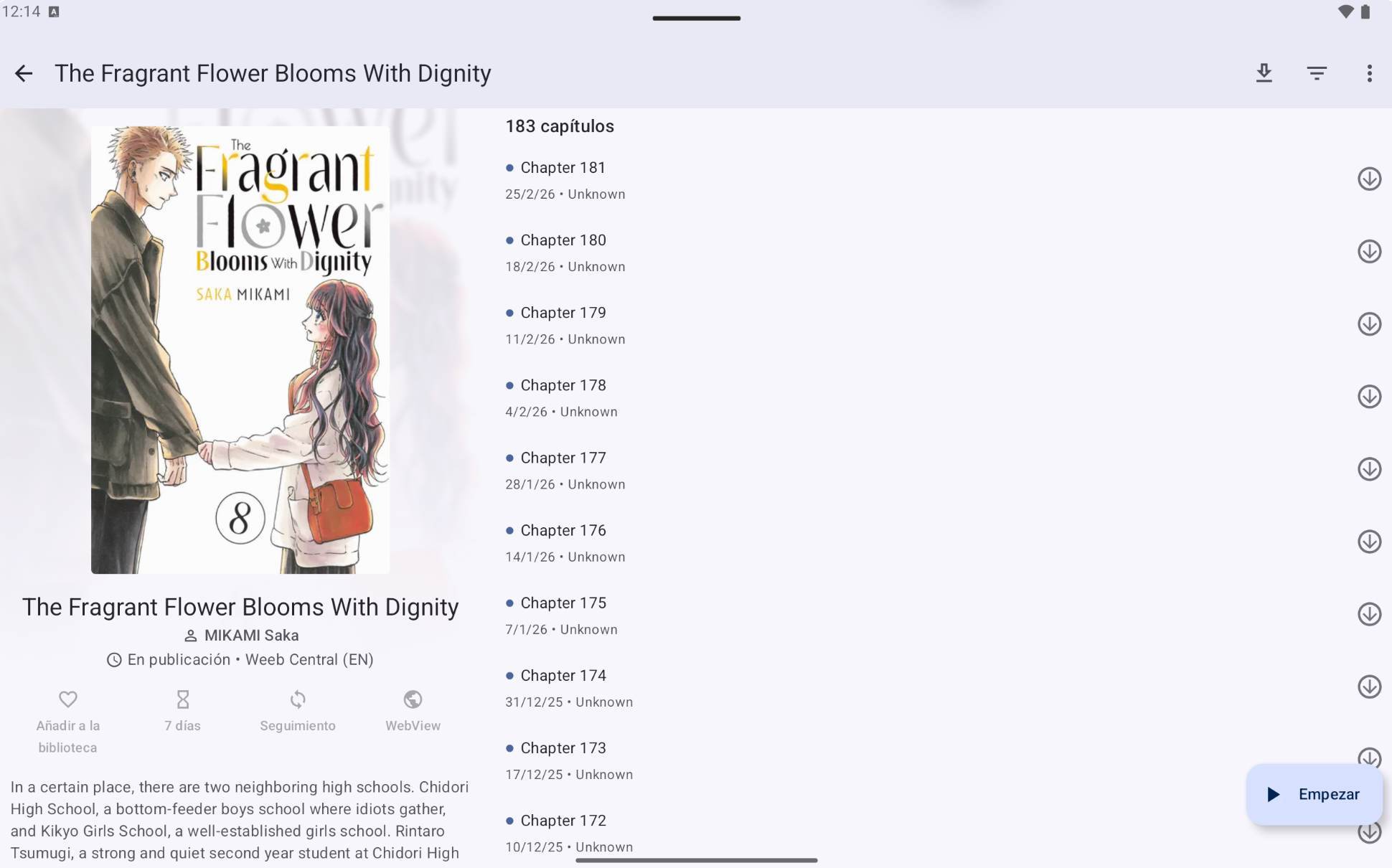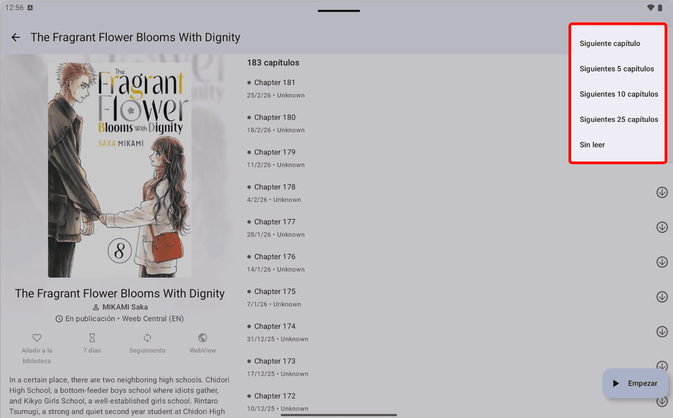Puedes pinchar en cualquiera de ellos para meterlos en tu biblioteca y leer o verlos en streaming. También se pueden descargar para su uso desconectado (pinchas en la flecha al lado de cada capítulo o directamente en la barra superior en la flecha para descargar capítulos por lotes).