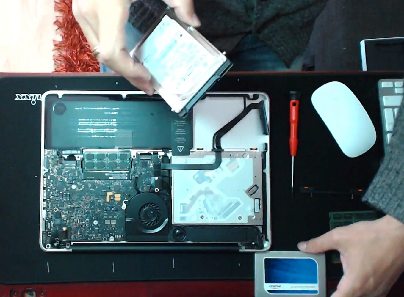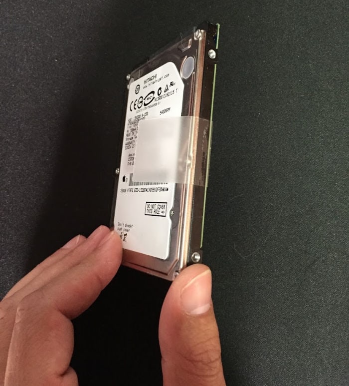 - A la hora de quitar el disco duro HDD hay que quitar un soporte que lo mantiene unido a la carcasa y la conexión con el Macbook. Luego quitas los tornillos del HDD y se los pones al SSD (a lo mejor sería interesante que Crucial lo vendiera con los tornillos).