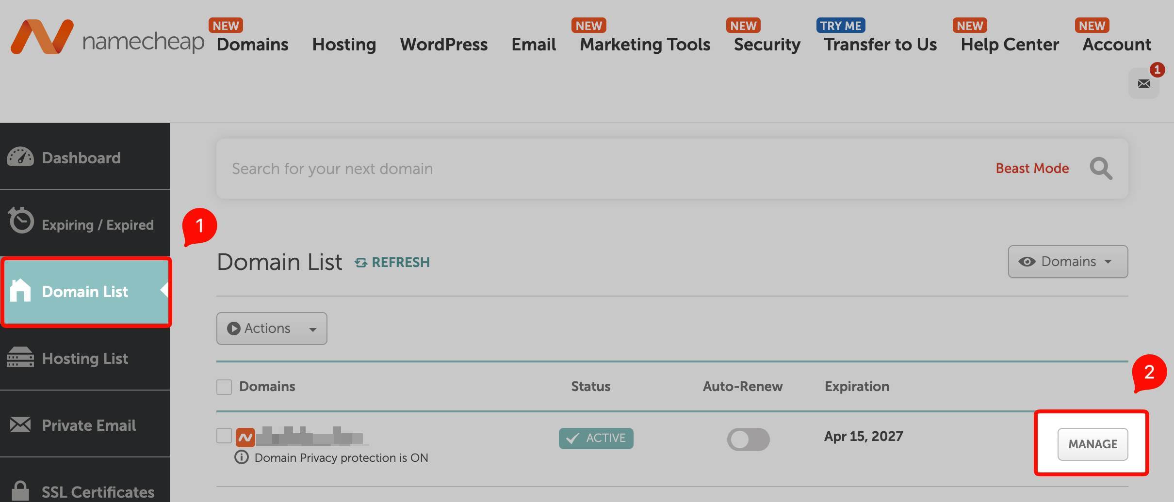 En el panel de control de Namecheap tienes que ir a Domain List y le das a Manage.
