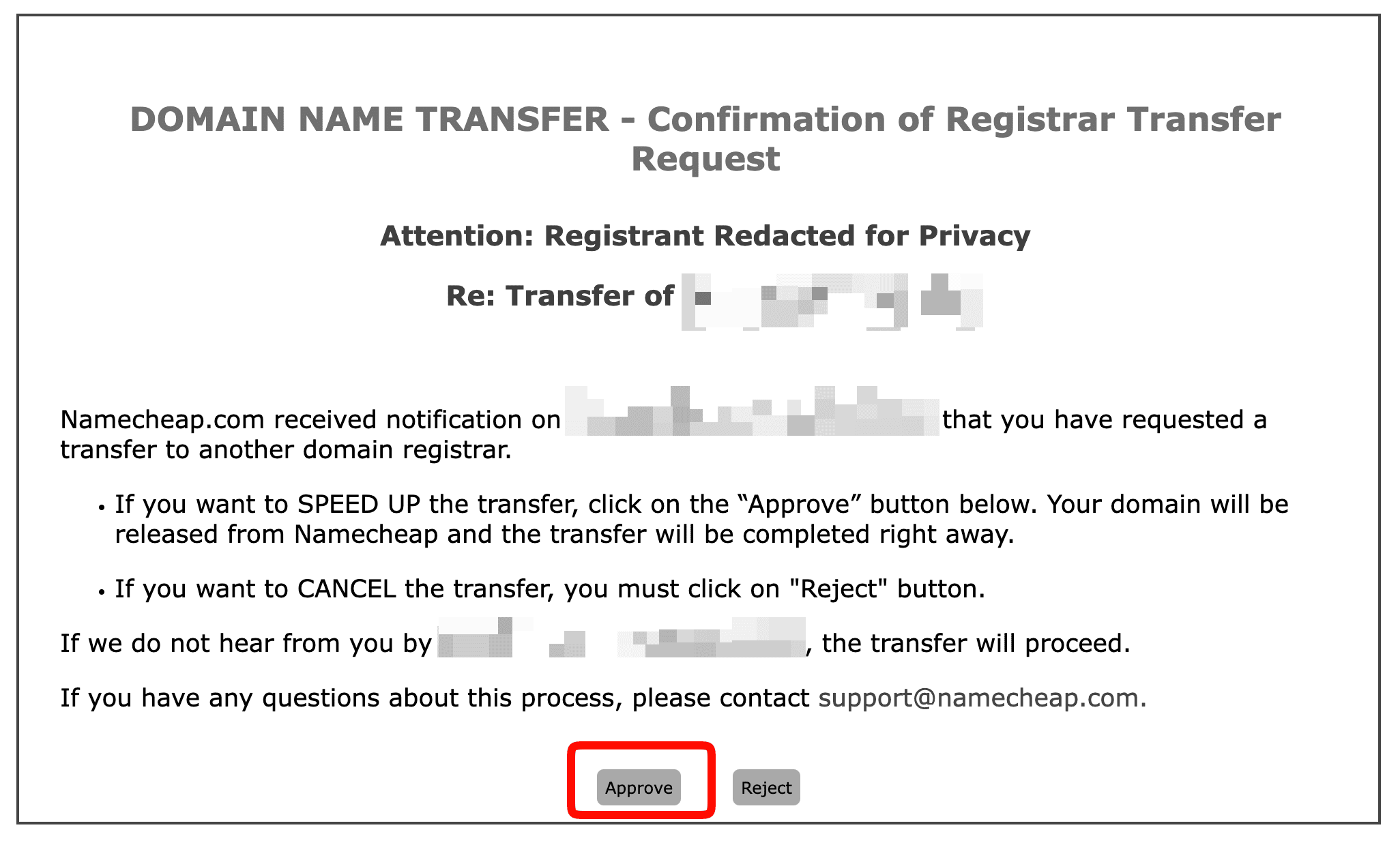¿Puedes acelerar el proceso? En el caso de los dominios .com, sí. Namecheap te va a enviar un email a tu cuenta de correo por si quieres confirmar la transferencia del dominio de manera inmediata.