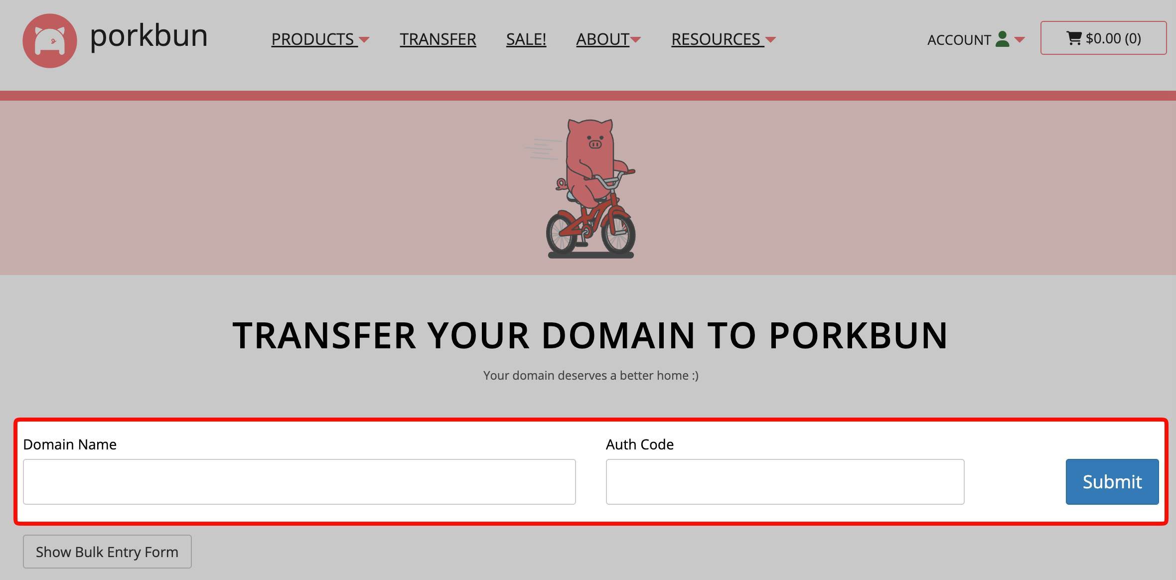 Vas a la url https://porkbun.com/transfer (si aún no tienes cuenta, créala antes de continuar. Configura el 2FA, un método de pago, correo electrónico de contacto y dirección postal).
