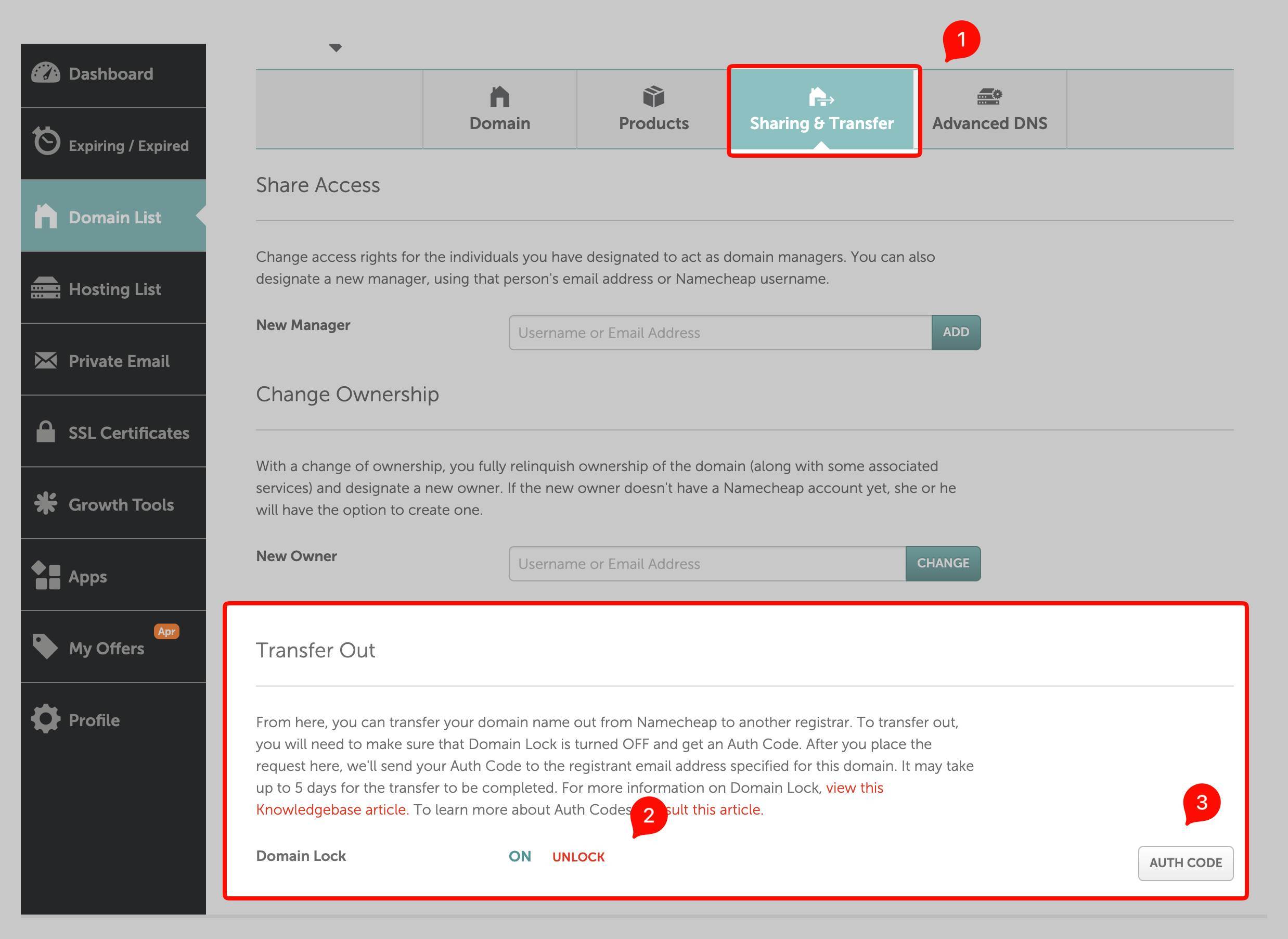 Luego vas a Sharing & Transfer y en la sección Transfer Out > Domain Lock le damos a UNLOCK y luego pedimos un código AUTH CODE en el botón de la derecha: