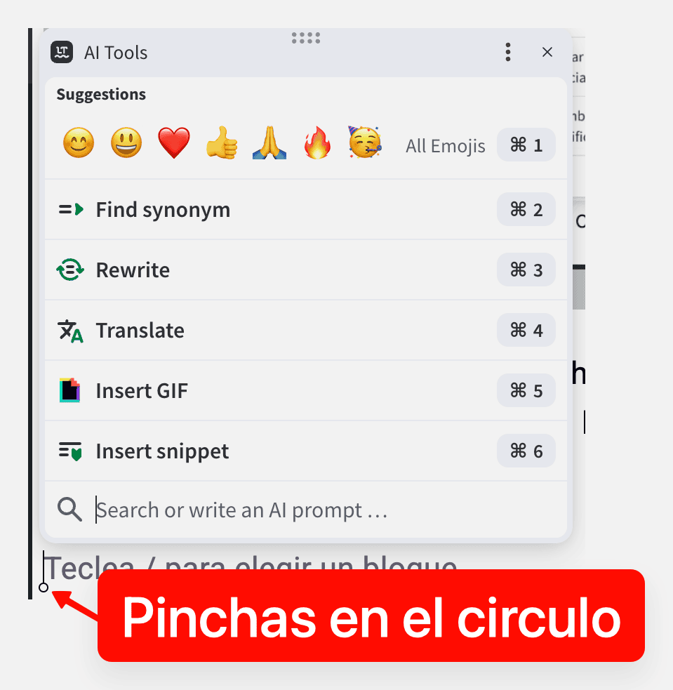 Cuando estés escribiendo texto, fíjate en el cursor: aparece una bolita en su parte inferior que puedes pinchar para que te salga un nuevo menú como el que ves en la foto: puedes poner emojis, reescribir el texto, cambiar el texto con un prompt de IA, encontrar sinónimos, insertar gifs o snippets (fragmentos de texto que usas mucho y que has guardado previamente).