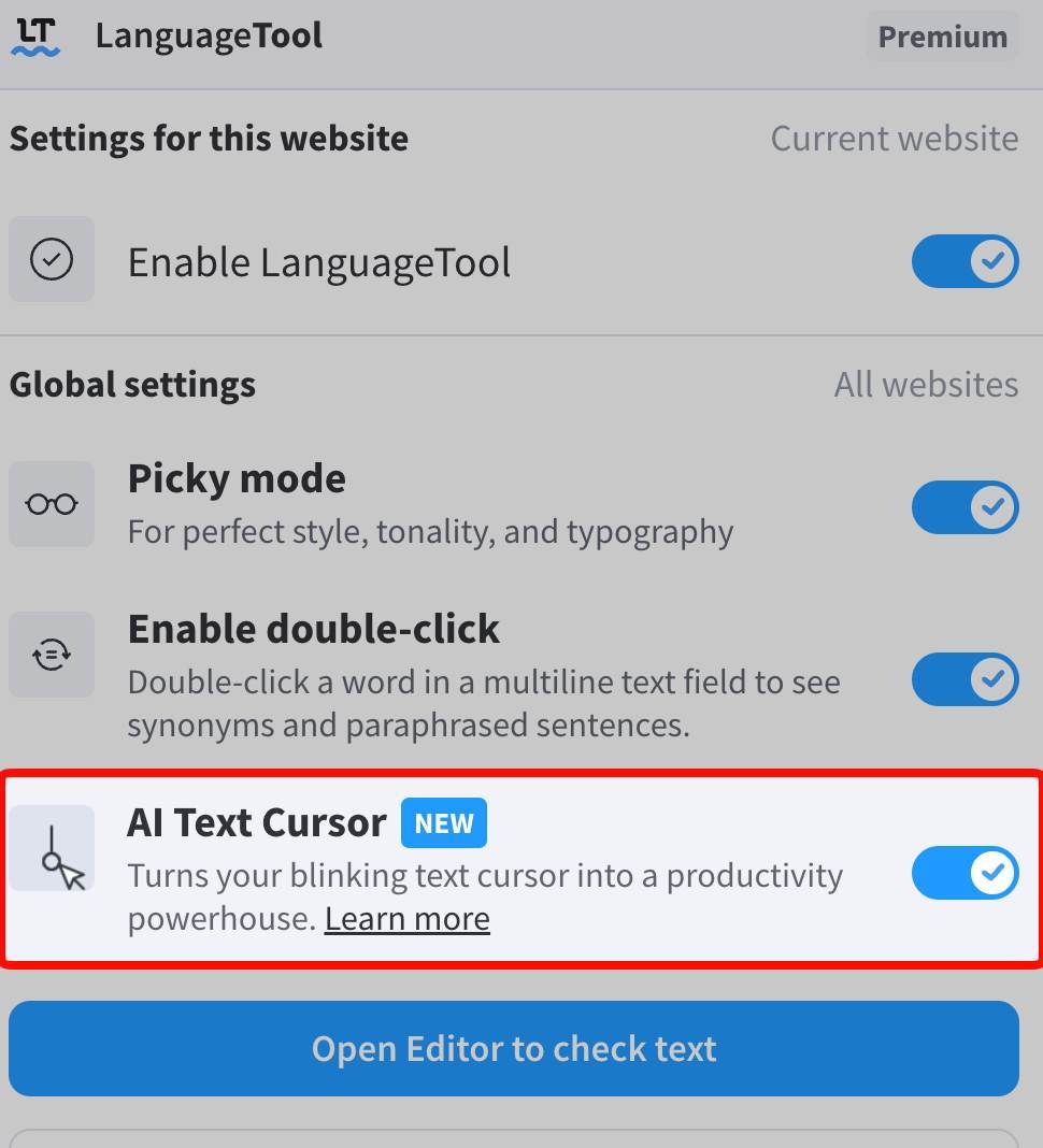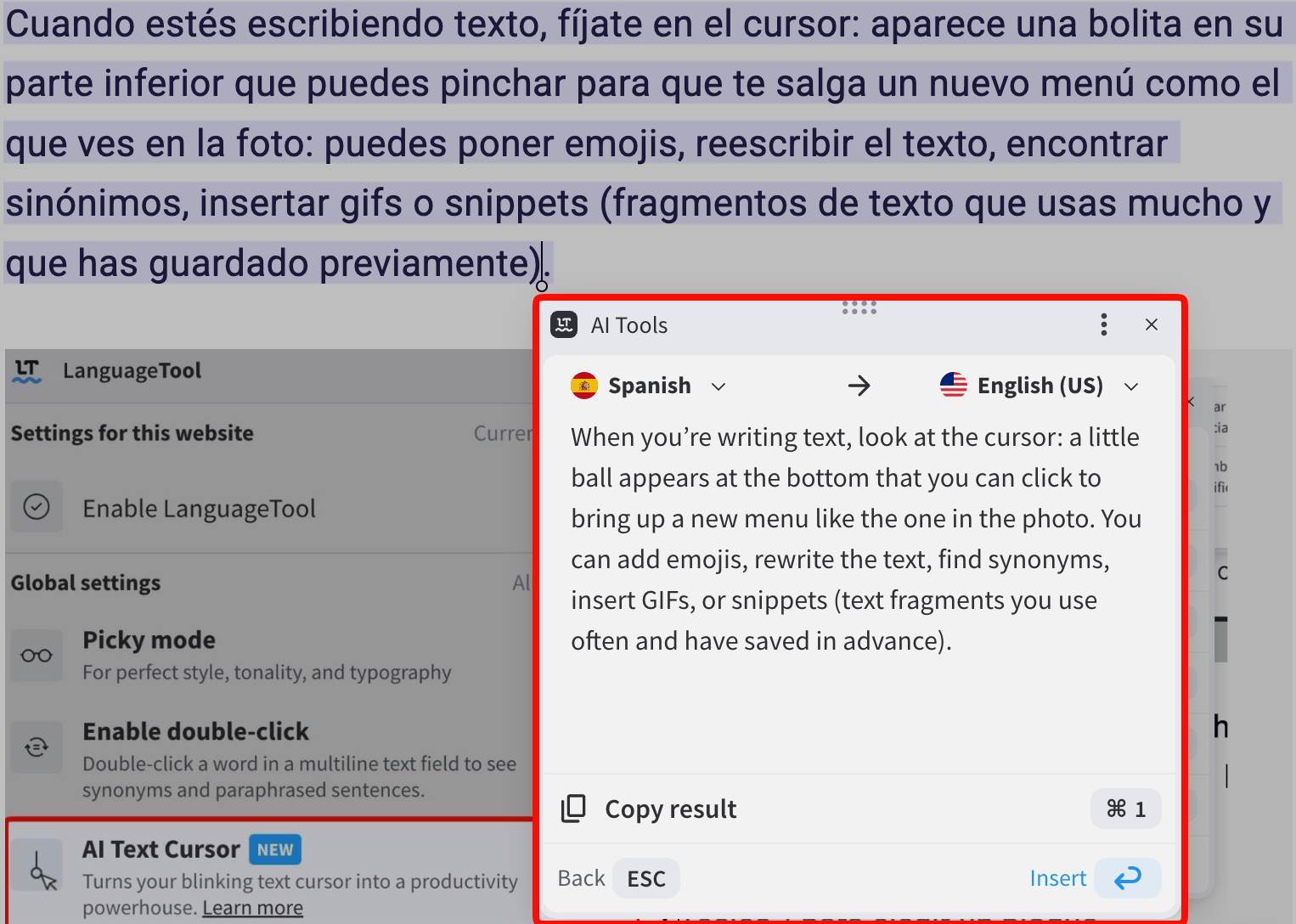 En 2026 han seguido mejorando la herramienta IA y ahora se llama AI Text Cursor (se activa en el menú de la extensión) y han añadido una opción para añadir fragmentos o snippets, un buscador de emojis y la integración con GIPHY.