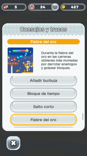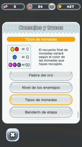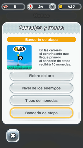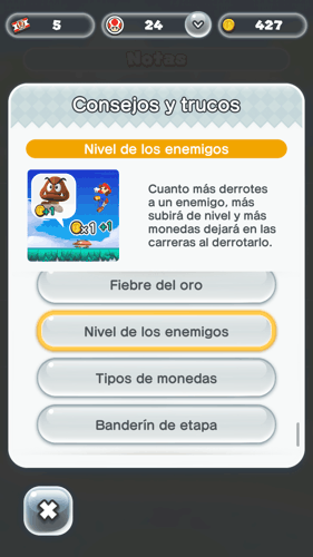 Cómo conseguir más monedas rosas, el nivel de tus enemigos, como llegar a zonas nuevas con el arco iris, como conseguir 10 monedas más al llegar al banderín en el modo carrera, cómo funciona la fiebre del oro o cuales son los tipos de monedas en Super Mario Run.