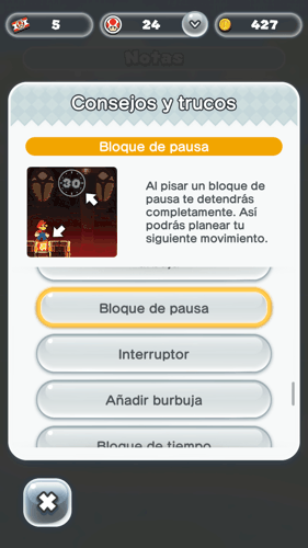 En el juego estás siempre corriendo, excepto si Super Mario llega a un bloque con el símbolo de pausa en él: se parara y podrás pensar tu recorrido o simplemente descansar un poco y quedarte un poco más tranquilo.