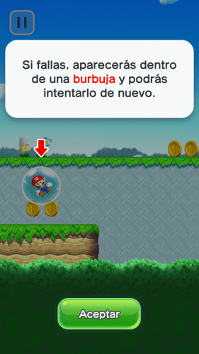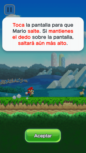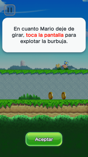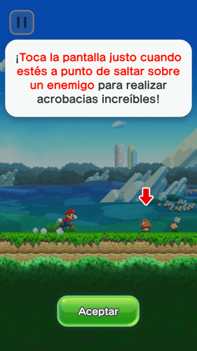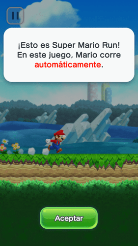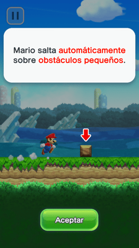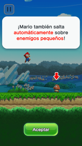 Tienes la opción se seguir un pequeño tutorial que puedes repetir muchas veces donde te indican los principales movimientos de Super Mario Run. Hazlo varias veces. aprende cómo saltar correctamente, como superar a los enemigos y a como realizar acrobacias con Super Mario Run. Aquí tienes las capturas del tutorial.