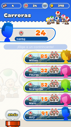 Una especie de modo multijugador donde compites con otras personas (no es en tiempo real). Fíjate bien en el nivel que tienen y en su color: conseguirás distintos Toads que te permitirán comprar diferentes cosas.