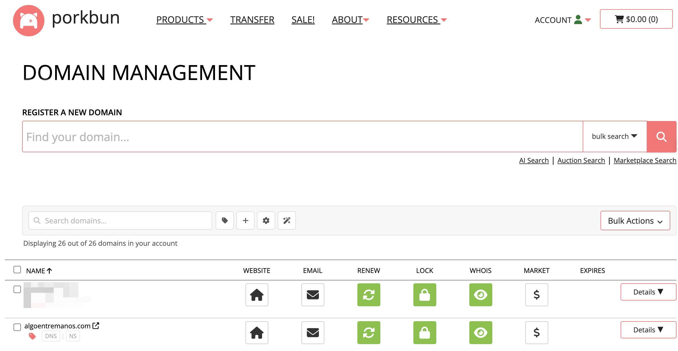También es importante que sepas que, si quieres llevarte el dominio desde Porkbun a otro registrador, puedes hacerlo fácilmente pidiendo el Authorization code en REGISTRAR TRANSFER. Además, puedes transferir el dominio a otra cuenta de Porkbun en ACCOUNT TRANSFER.