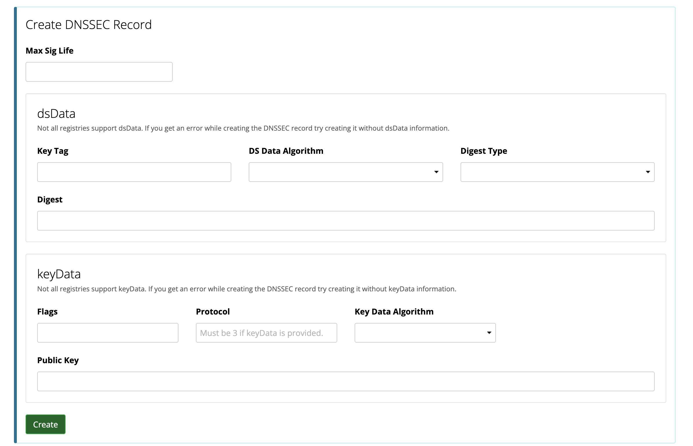 En REGISTRY DNSSEC puedes activar esta opción. En mi caso, he pegado los datos que me ha dado Cloudflare para este servicio. DNSSEC es una forma de “firmar” digitalmente tus datos DNS, evitando ataques DNS. Si pinchas en el lápiz para editarlos, verás algo así (te recomiendo configurarlo):
