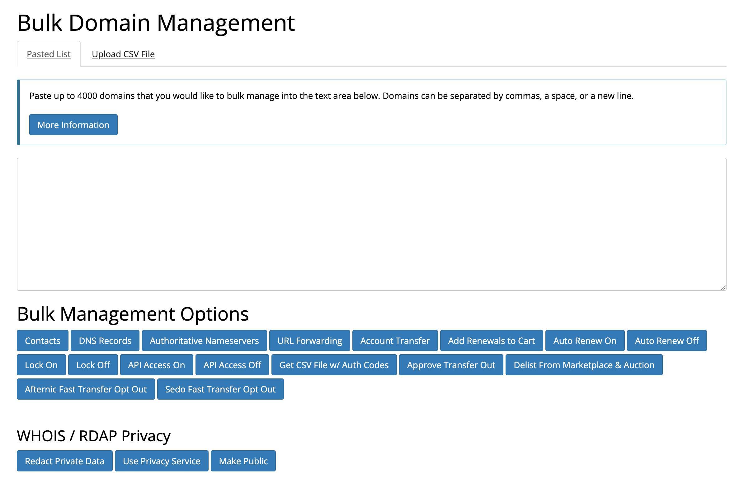 Más cosas. No lo he usado, pero tiene una opción interesante si tienes muchos dominios que gestionar. En ACCOUNT > Bulk Domain Management, puedes gestionar todos los parámetros anteriores en masa, copiando y pegando todos los dominios que quieres modificar o subiendo un archivo CSV con todas las opciones.