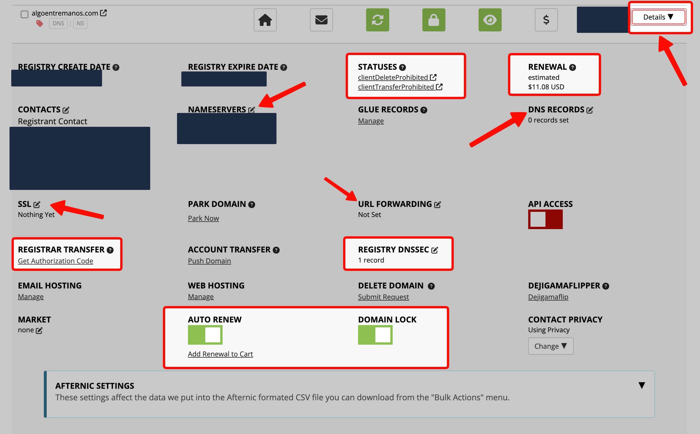 Puedes acceder a todos los datos de tus dominios en ACCOUNT > Domain Management. Verás algo como esto: