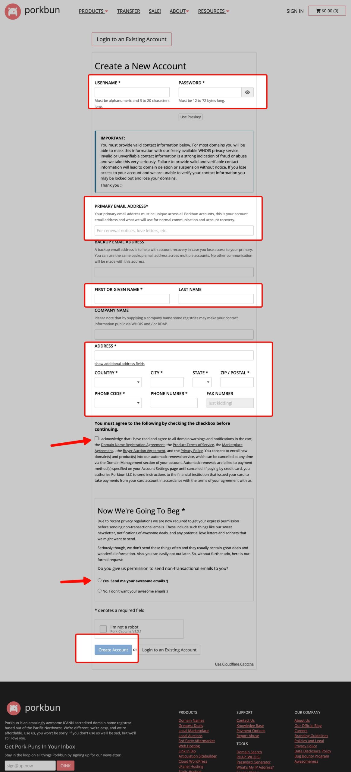 Formulario de registro en el registrador de dominios Porkbun.